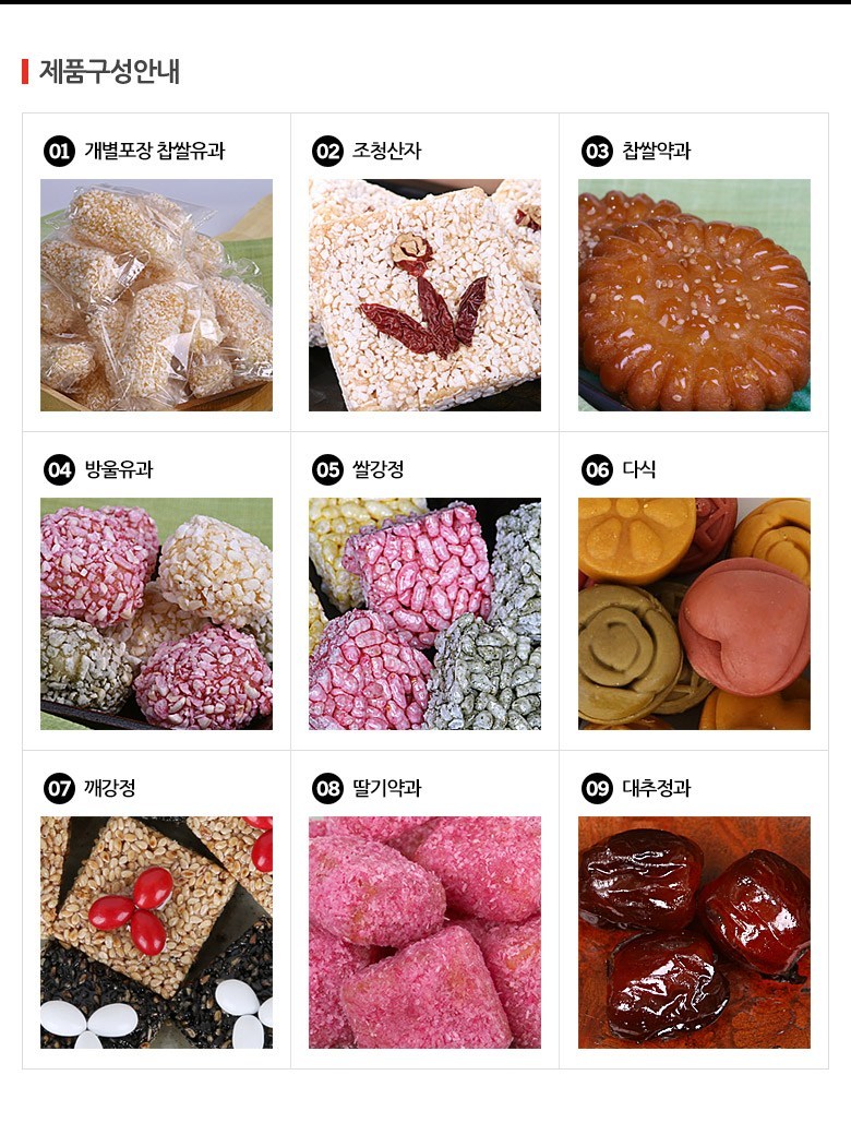 - 상단제품 : 조청산자, 찹싹약과, 방울유과, 쌀강정, 깨강정, 블루벨리약과, 딸기약과, 다식, 대추정과, 호두정과 등