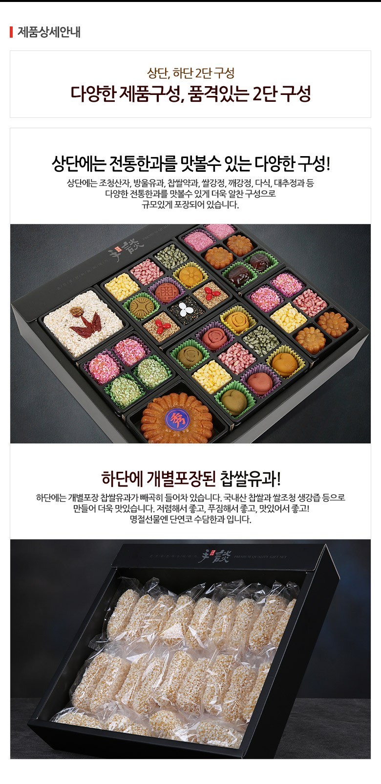 상단에는 전통한과 위치해있고, 하단에는 개별포장된 찹쌀유과가 있습니다.